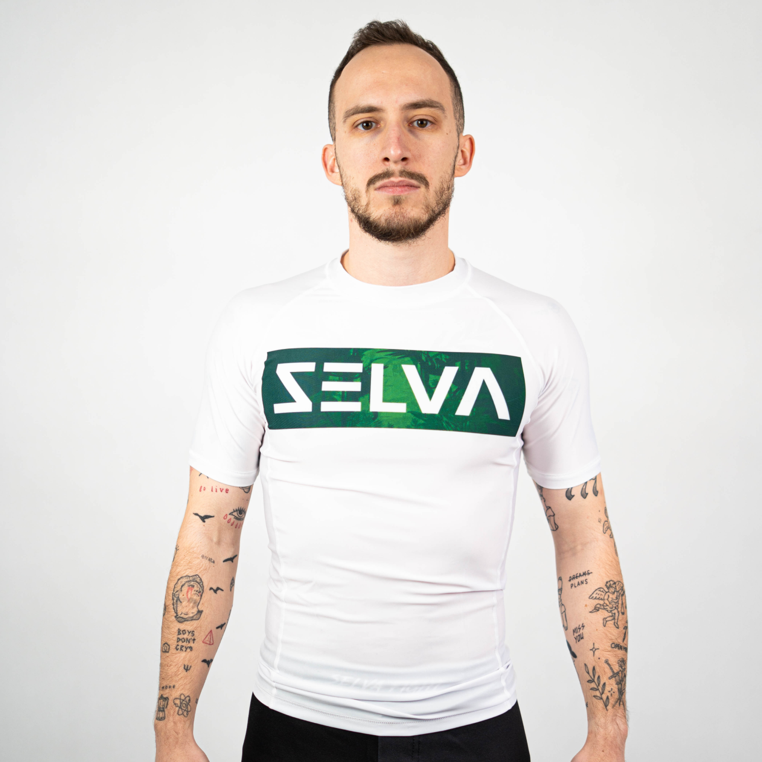 SELVA FIGHT WHITE CLASSIC to rashguard dla osób, które cenią prostotę i najwyższą jakość wykonania. Klasyczna biel w połączeniu z subtelnym, lecz wyrazistym logo w postaci białego napisu na zielonym tle na klatce piersiowej nadaje mu elegancki, sportowy charakter.